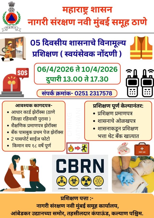 कल्याण: महाराष्ट्र शासनाच्या ‘नागरी संरक्षण नवी मुंबई समूह, ठाणे’ यांच्या वतीने ठाणे जिल्ह्यातील नागरिकांसाठी ६ एप्रिल २०२६ ते १० एप्रिल २०२६ दरम्यान दुपारी १:०० ते संध्याकाळी ५:३० वाजेपर्यंत नागरी संरक्षण नवी मुंबई समूह कार्यालय, आंबेडकर उद्यान समोर, तहसीलदार कंपाउंड, कल्याण (पश्चिम) या ठिकाणी ५ दिवसीय विनामूल्य प्रशिक्षण शिबिराचे आयोजन करण्यात आले आहे. या प्रशिक्षणाद्वारे स्वयंसेवकांची नोंदणी केली जाणार असून, प्रशिक्षण पूर्ण करणाऱ्या उमेदवारांना शासनाकडून विविध लाभ दिले जाणार आहेत.